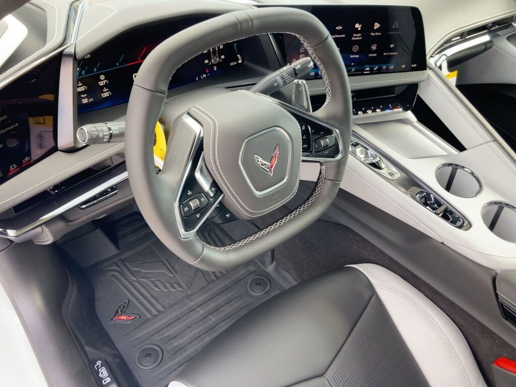Traction control, all-speed, Tires, 245/35ZR19 front and 305/30ZR20 rear, blackwall, all-season, performance, Theft-deterrent system, vehicle, push button start, immobilizer and audible visual alarm, Theft-deterrent system, electrical, unauthorized entry, activates the horn, Theft deterrent sensor, vehicle interior movement, Theft deterrent sensor, vehicle inclination, Suspension, Corvette standard, Steering, power, electric speed-sensitive, rack-and-pinion, variable ratio, Steering wheel, leather-wrapped, Steering wheel, heated, Steering wheel controls, audio, voice recognition, cruise and Driver Information Center, Steering column, power tilt and telescopic, SiriusXM with 360L Trial Subscription SiriusXM with 360L transforms your customers' ride with our most extensive and personalized radio experience on the road. (IMPORTANT: The SiriusXM trial subscription is not provided on vehicles that are ordered for Fleet Daily Rental ("FDR") use. Trial subscription is subject to the SiriusXM Customer Agreement and privacy policy, visit siriusxm.com which includes full terms and how to cancel. All fees, content, features, and availability are subject to change. Some features require GM connected vehicle services.), Side Blind Zone Alert, Seats, heated and vented driver and passenger, Seats, GT1 bucket, Seat belt color, Black, Seat adjuster, power passenger lumbar control, Seat adjuster, power driver lumbar control, Seat adjuster, passenger power bolster.