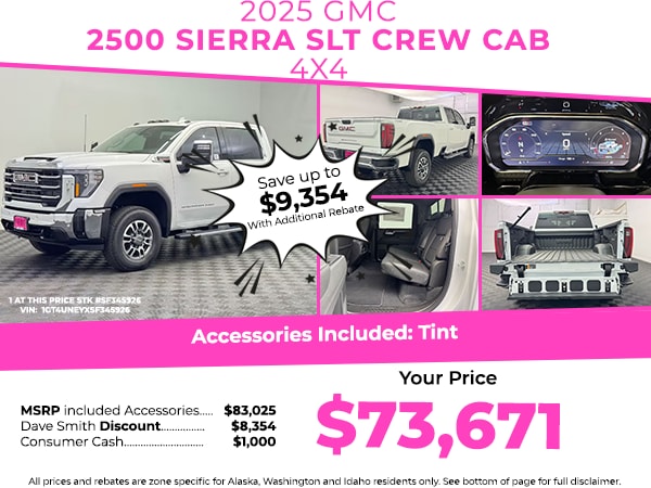 SLT Convenience Package: Ventilated Driver and Front Passenger Seats; Bose Premium 7-Speaker Sound System; 2 Charge/data USB Ports Inside Center Console; LED Smoked Amber Roof Marker Lamps; Wireless Charging; Front Bucket Seats. SLT Preferred Package: Heated 2nd Row Outboard Seats; Power Sliding Rear Window with Defogger; Universal Home Remote; Adaptive Cruise Control. SLT Premium Package: Spray-On Pickup Bedliner with GMC Logo; 6" Rectangular Chromed Tubular Assist Steps. Sierra HD Pro Safety Plus Package: HD Surround Vision; Trailer Side Blind Zone Alert; Rear Cross Traffic Alert; Ultrasonic Front and Rear Park Assist; Safety Alert Seat; Trailer Cam Provisions and Trailer Viewing Software; Bed View Camera with Two Trailer Camera Provisions. Preferred Equipment Group 4SA: LED Cargo Area Lighting; SiriusXM with 360L Trial Subscription; Remote Vehicle Starter System; Electric Rear-Window Defogger; Chrome Surround Grille with Chrome Insert Bars; Unauthorized Entry Theft-Deterrent System; Front Rain-Sensing Wipers; Sierra HD Pro Safety; Wireless Phone Projection; 120-Volt Instrument Panel Power Outlet; Heated Driver and Front Outboard Passenger Seats; 2 Charge/data USB Ports; Steering Wheel Audio Controls; 2 Charge-Only Rear USB Ports; OnStar Services Capable; 120-Volt Bed Mounted Power Outlet; Power Front Passenger Windows with Express Up/down; 2-Speed Active Transfer Case; Deep-Tinted Glass; 6-Speaker Audio System Feature; Manual Tilt-Wheel/telescoping Steering Column; Keyless Open and Start; ProGrade Trailering System; Push Button Start; Rear Wheelhouse Liners. Snow Plow Prep/camper Package: 220-Amp Alternator; Skid Plates. Power Sunroof. 6" Rectangular Chromed Tubular Assist Steps. Spray-On Pickup Bedliner with GMC Logo. Skid Plates. LED Smoked Amber Roof Marker Lamps. **Equipment listed is based on original vehicle build and subject to change. Please confirm the accuracy of the included equipment by calling the dealer prior to purchase.**